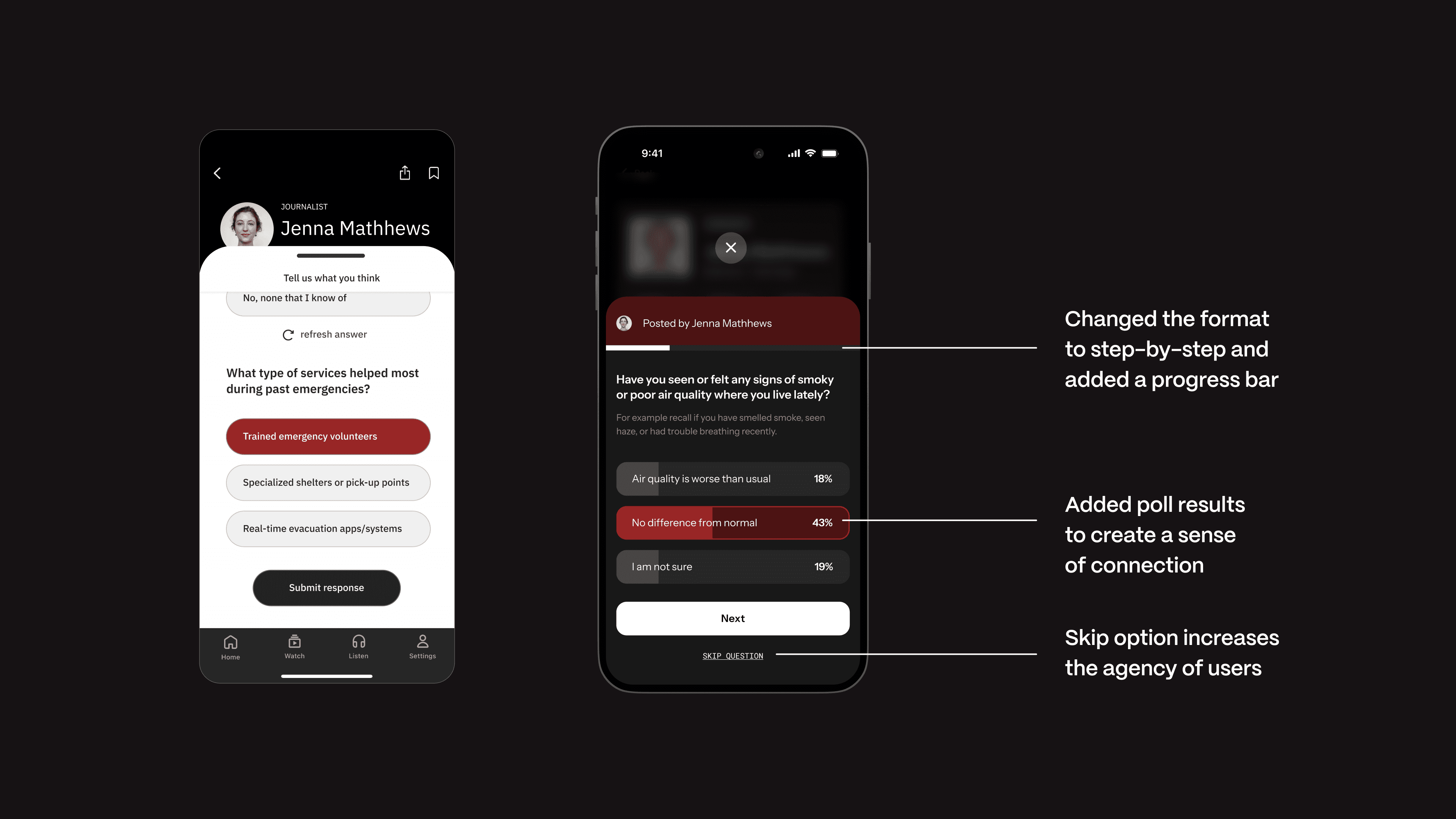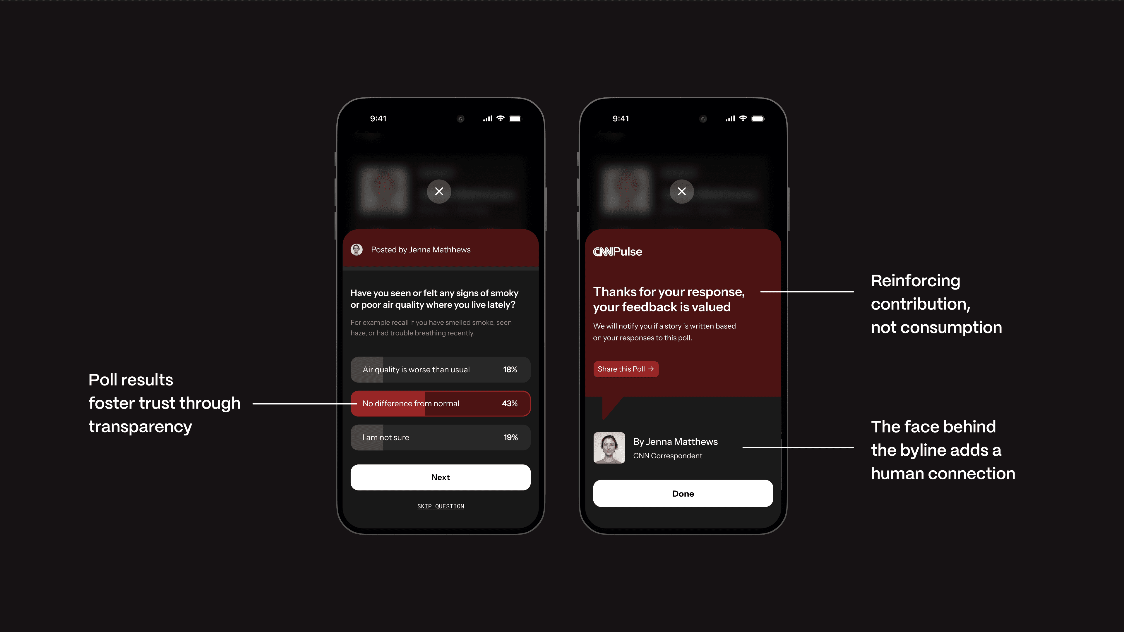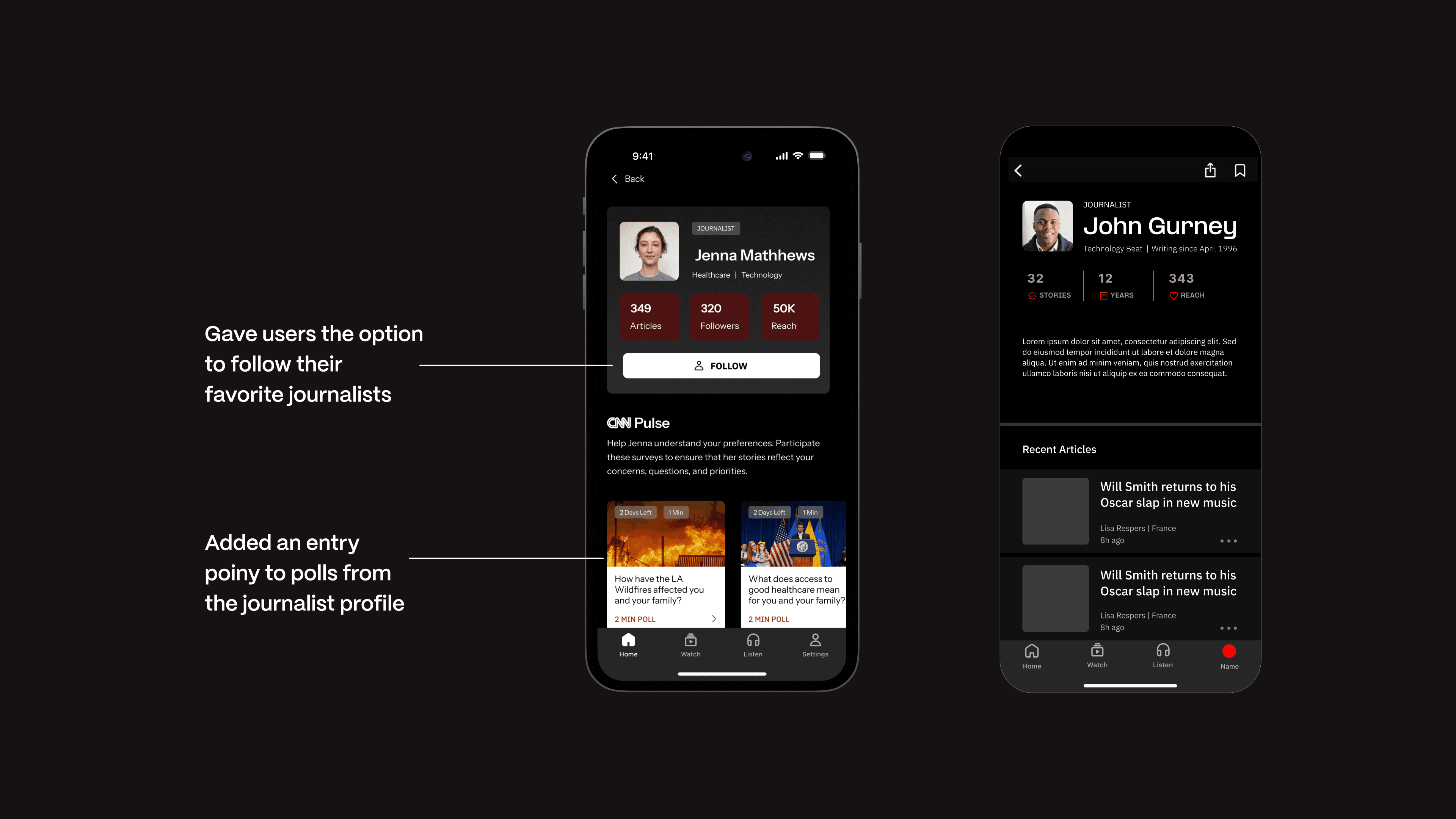 I led the ideation and visual direction, translating research insights into concrete product concepts. I prototyped core features such as Polls, Journalist Profiles, and Behind the Journalism modules. I led the visual design, shaping the editorial look and feel to for into CNN’s brand.
