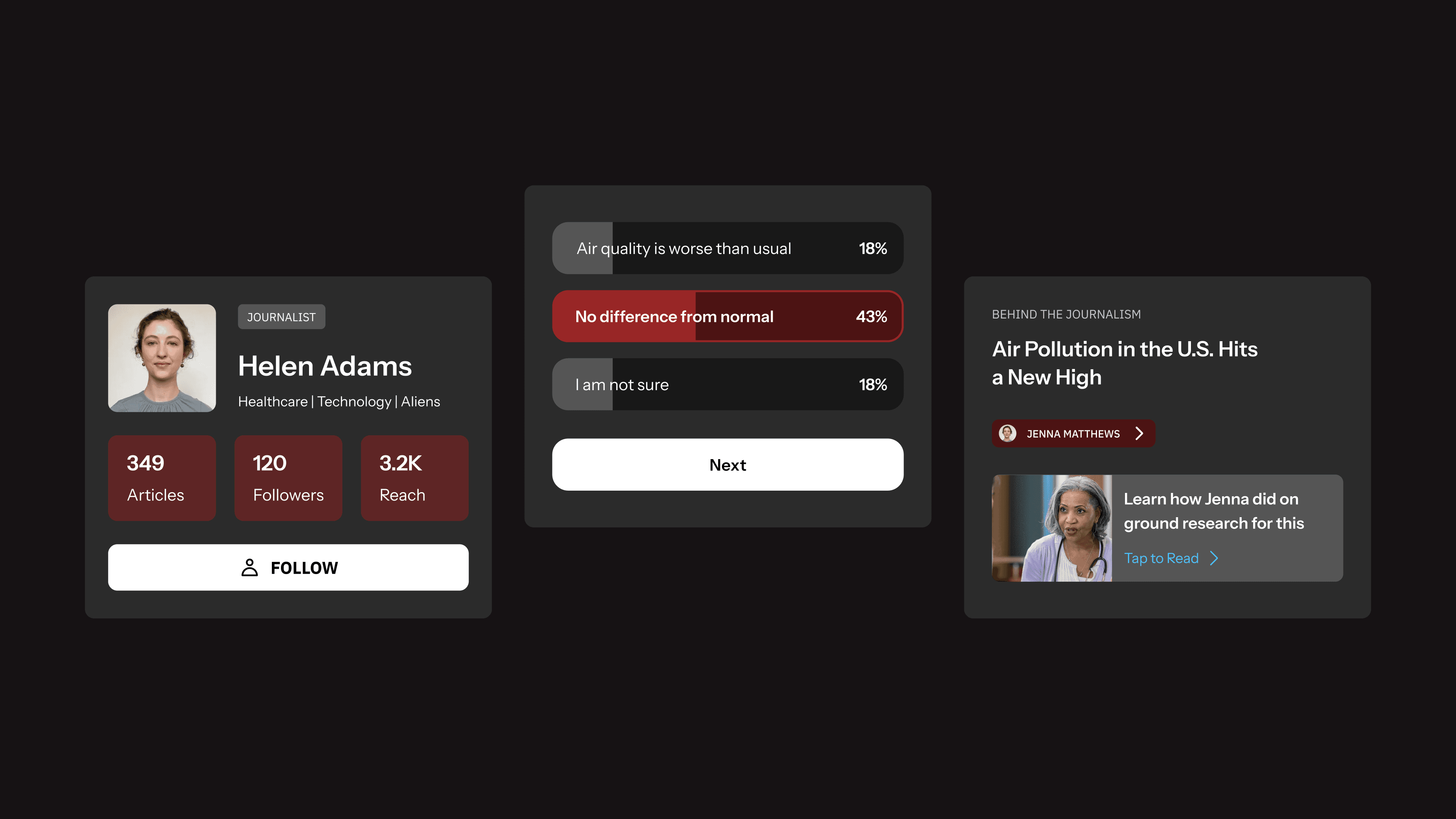 Each poll is attributed to a specific journalist to reinforce trust and accountability. Poll results and sharing options allow insights to spread beyond the article.