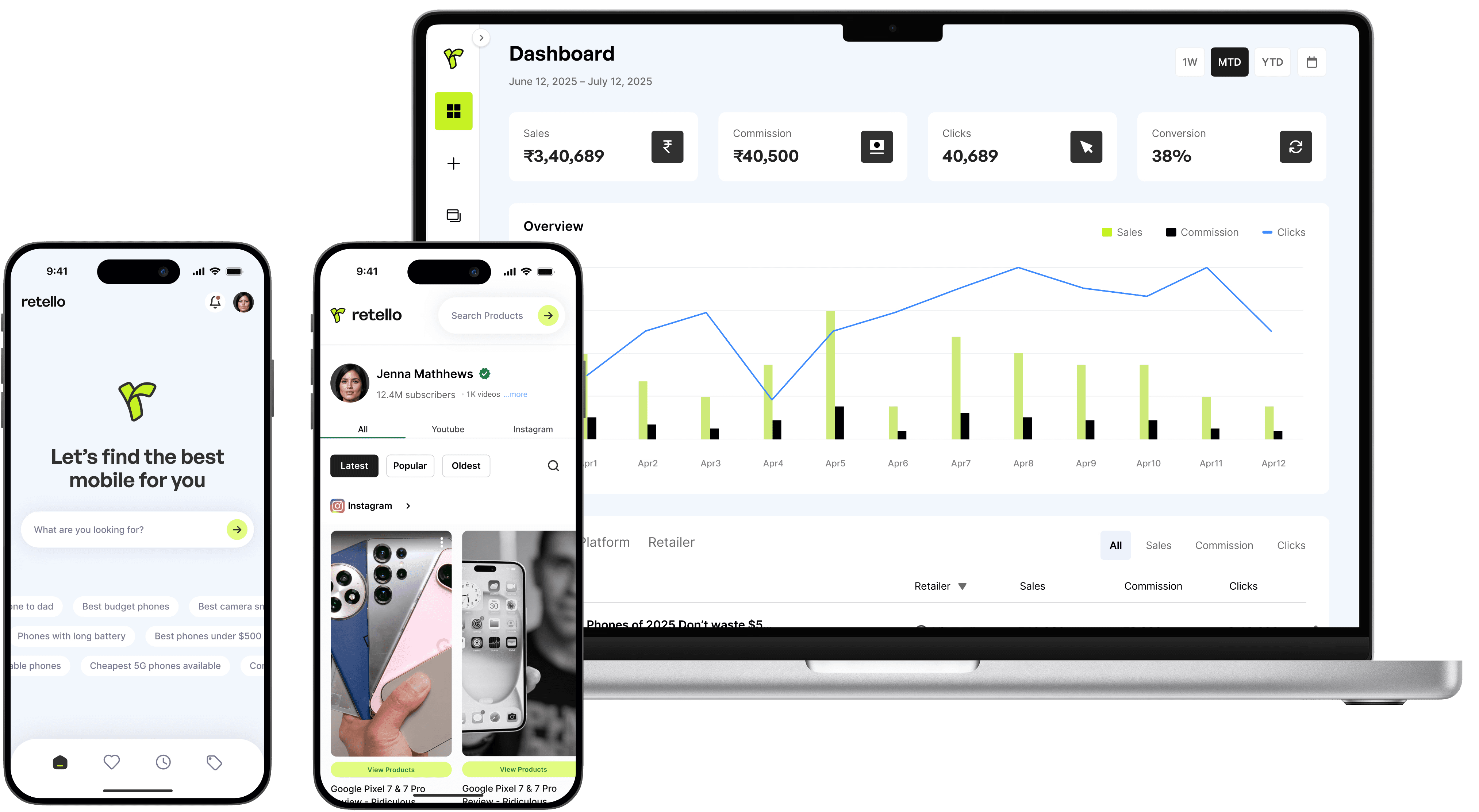 Retello.ai helps users go from intent to purchase with comparisons and retailer offers. The phase 1 included a consumer MVP with a creator platform as the GTM engine with tools that let creators publish videos.