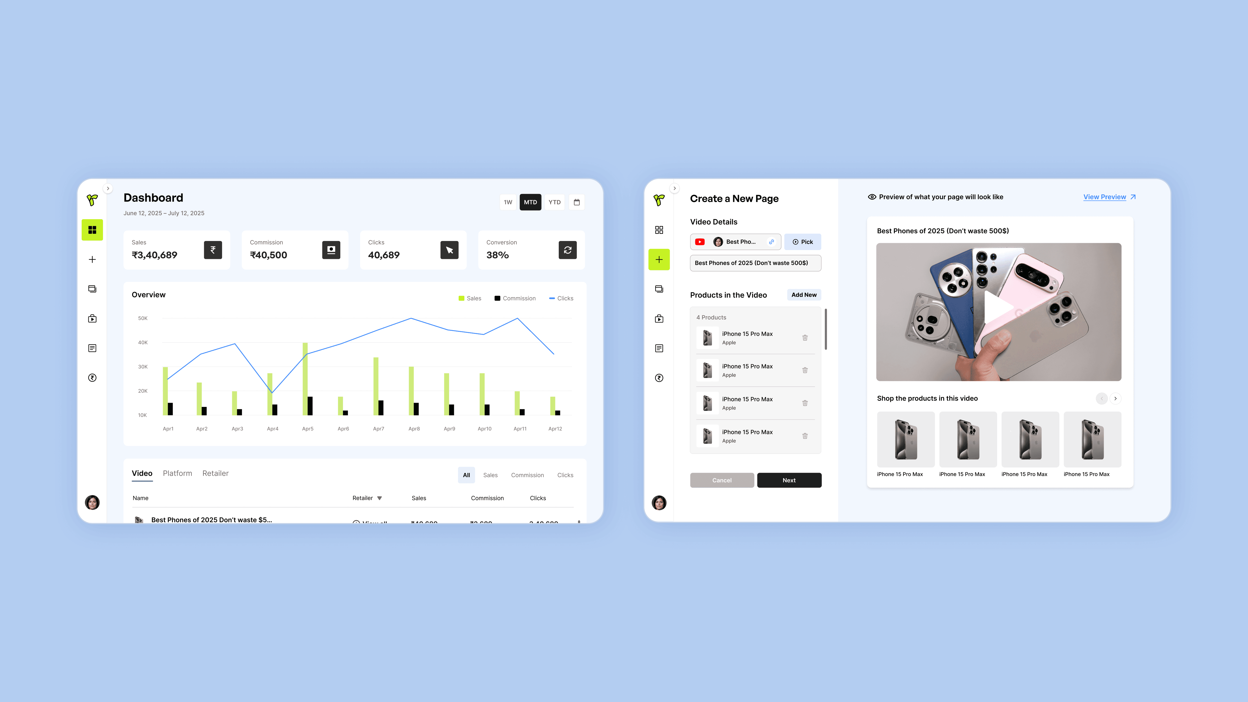 I designed the web platform creators use to monetize recommendations with transparency. The workflow focused on: connect accounts, paste a video, attach products, publish a clean destination page, and track performance.