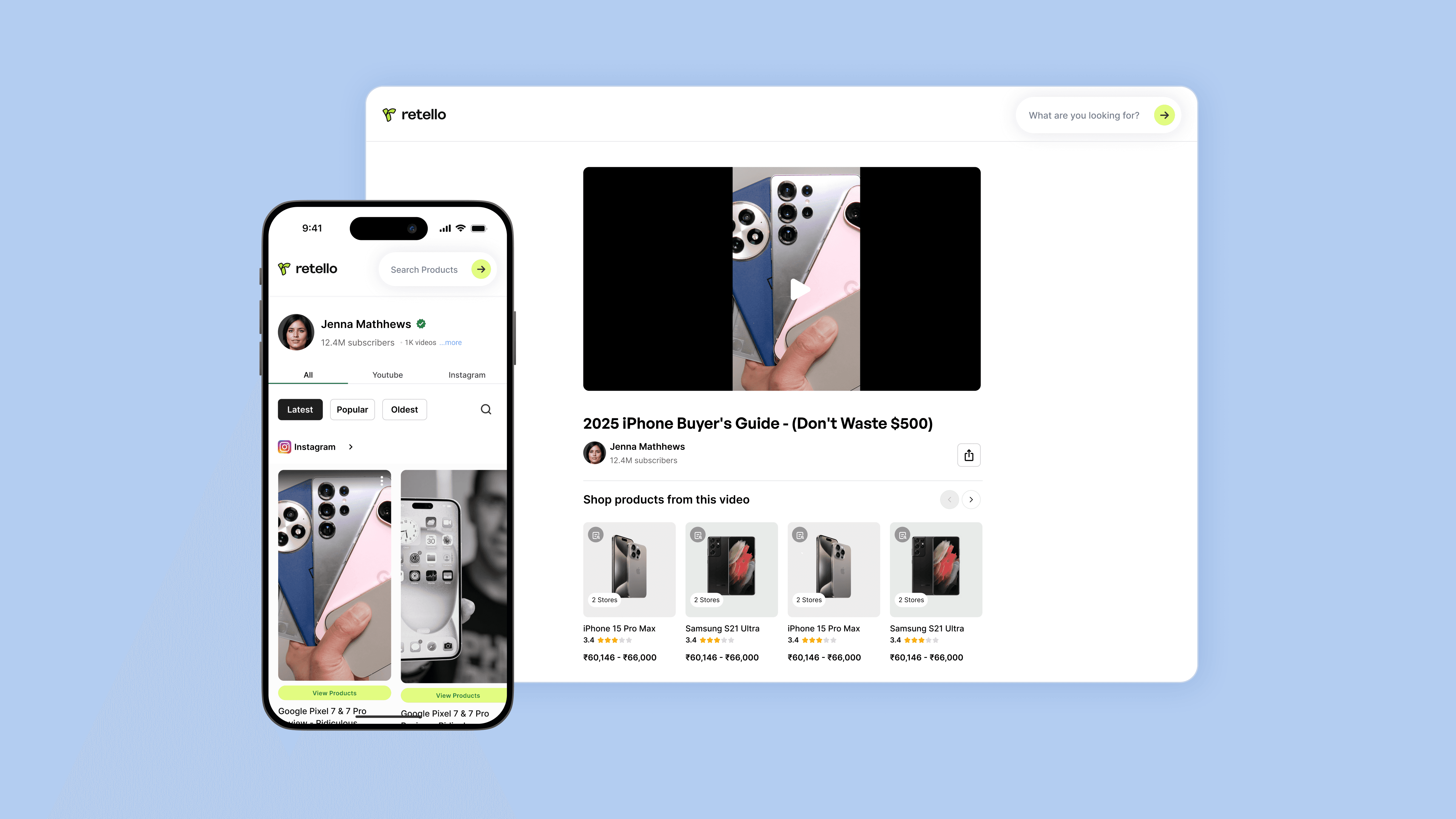 To close the gap between “I saw it” and “I’m ready to buy,” I designed video discovery surfaces across mobile and web that keep Retello's insights one tap away. Each page pairs the creator’s content with a product tray and consistent buying actions.